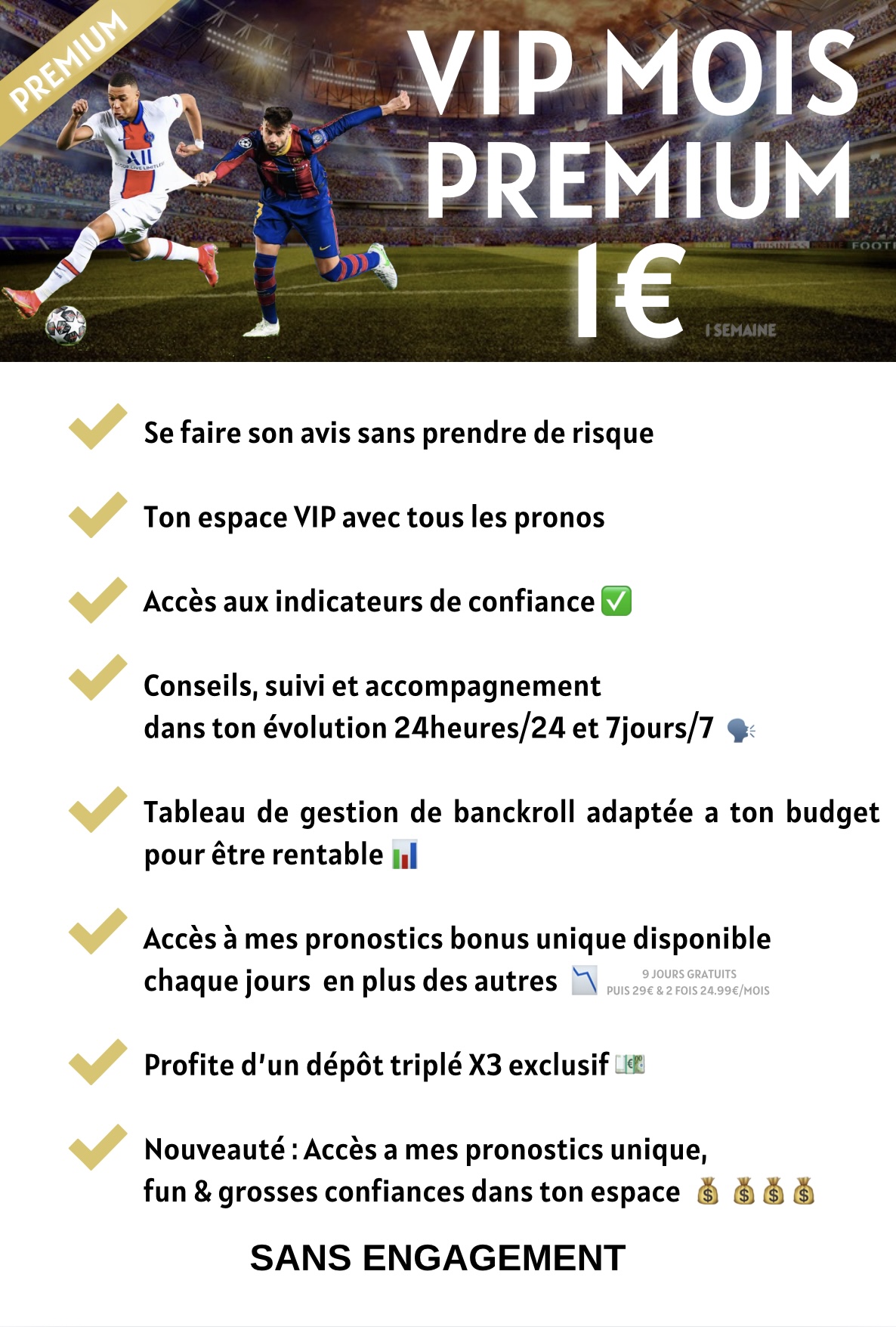 • Pour seulement 1€ profite des 5 BONUS + JUSQU’A 170€ OFFERT & DÉPÔT TRIPLE X3 + LES PRONOSTICS CÔTE TOTAL EN MOYENNE 3/4 + L’INTEGRALITÉ DE L’ACCES VIP MOIS + PRONOSTICS BONUS + PRONOSTICS TRÈS GROSSES CÔTES + UN ACCOMPAGNEMENT 24HEURES/24 et 7JOURS/7